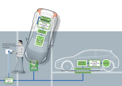 在感应式充电系统中,充电板被埋在地下,比如在自家停放汽车的车道下。充电板由可产生电磁场的线圈组成,当汽车停放在充电板上方时,电能会以交流电的形式从充电板直接传给汽车的感应接收器,然后在汽车内的电压转换器中转变为直流,给汽车的蓄电池组完成充电,它的先进之处在于整个充电过程都不需要汽车与充电板的直接接触。这一技术将极大地降低充电时间,以沃尔沃C30电动车为例,在蓄电池完全放电的情况下,给24千瓦时大小的蓄电池组完全充电,预计仅用一小时二十分钟。