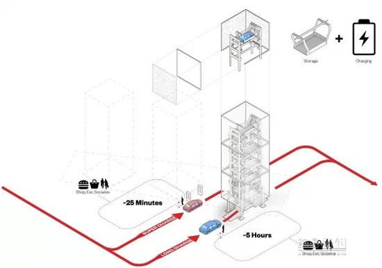 当然,恩尼德的设计方案也借鉴了特斯拉的超级充电站(Supercharger)设计,毕竟所有的充电桩都位于塔楼的底部,而且设计师们也使用了Model S的效果图。此外,恩尼德承认立体停车场的观点也不是什么新型观点,毕竟立体停车场也已经应用了几十年时间了。