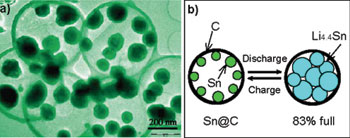 金属锡和锂可以生成Li4.4Sn合金,具有很高的理论比容量(992mAh/g),长期以来得到电池电极材料研究者的极大关注。然而,Li与Sn形成合金时,伴随有巨大的体积膨胀,因此循环性能较差,限制了其实际应用。最近,该课题组通过设计预留空腔的电极结构,提供了一种简易的解决方案,成功地把Sn纳米颗粒填充到弹性的碳空心球中,设计合成出具有特殊纳微结构的Sn@C复合材料。该Sn@C纳微复合结构中含有一定体积的空腔,使得嵌Li体积膨胀后的Li4.4Sn合金也可以被容纳在C空心球中,从而消除了Li插入/脱出过程中产生的应力,极大地改善了电极材料的循环性能。电池测试结果表明,100次充放电循环后,该复合材料仍具有高达550mAh/g的比容量,为目前广泛使用的石墨负极材料理论比容量(372mAh/g)的1.5倍,是一种很有前途的高容量锂离子电池负极材料。