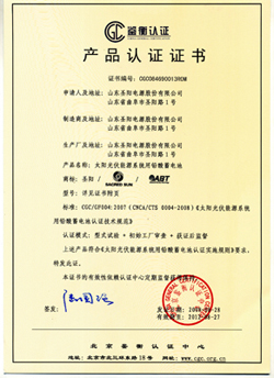 2008年8月28日,山东圣阳电源股份有限公司铅酸蓄电池通过了太阳能光伏产品金太阳认证,成为首家获得此项荣誉的蓄电池企业,金太阳认证方——“北京鉴衡认证中心”已于9月1日在其官方网站首页正式对外公布此消息。此次圣阳荣登“金太阳”认证榜首,不仅标志着太阳能光伏用铅酸蓄电池认证体系正式建立,更印证了我公司产品在市场上的带头性和领先性,成为消费者在选购太阳能光伏用铅酸蓄电池时最权威、最可靠的依据。