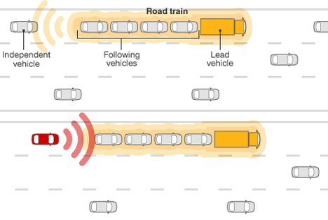如果你想加入这一车队,你只需通过GPS系统向“头车”司机发出信号,让他知道你想加入车队。然后停在车队后边,你的车就会自动跟随车队前行,您就可以放松下来,干你想干的事情。当快到终点时,你可以向“头车”司机发信号,要求释放你的机车,并重新控制自己的车。尽管这一概念还比较概略,但不久的将来,在欧盟的道路上这或许就成为现实。