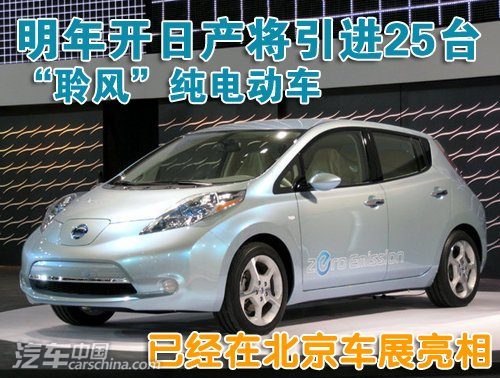 在2009年今年4月,日产汽车与工信部签订了一份谅解备忘录,Leaf聆风电动车将于2011年进入中国市场销售,并且消费者有望获得6万元购车补贴。日产Leaf聆风是一款5门掀背式两厢纯电力驱动的零排放环保车型,Leaf聆风是以骐达为基础开发的车型,配备了由锂离子电池驱动的电动机为动力,巡航里程可以达到160公里以上,能够满足消费者在城市中的用车要求。