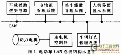 德国Bosch公司为了解决现代车辆中众多的控制和数据交换问题,开发出一种CAN(Controller Area Network)现场总线通讯结构,广泛应用在常规燃油汽车上,如BENZ、BMW、PORSCHE。同时,CAN总线也被认为是电动车最佳通讯结构,我国“863计划”关于电动汽车的说明中已经明确提出,新申报的电动车开发项目必须采用CAN总线通讯模式。