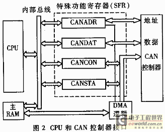 启用CAN控制器的功能,主要借助四个特殊功能寄存器(SPR)实现,CPU对CAN控制器的控制及其访问都通过它们完成,接口结构如图2所示。这四个特殊功能寄存器分别为:(1)地址寄存器(CANADR),CPU通过CANADR读/写CAN控制器的验收码寄存器;(2)数据寄存器(CANDAT),CANDAT对应由CANADR指向的CAN控制器内部寄存器;(3)控制寄存器(CANCON),它具有两个功能,读CANCON意味着访问CAN控制器的中断寄存器,写CANCON意味着访问命令寄存器;(4)状态寄存器(CANSTA),具有两个功能,读CANSTA是访问CAN控制器的状态寄存器,写CANSTA是为后续的DMA传输设备内部数据存储器RAM的地址。此外,DMA逻辑允许CAN控制器与CPU在片主RAM之间的高速数据交换。