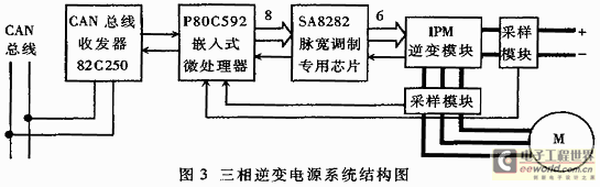 本文介绍的电动车用三相逆变电源属于图1中的车载辅助逆变电源。称为“辅助电源”是因为它的负载为电动车上的一些辅助交流电机,如汽车转向助力油泵、刹车气泵、冷却水循环中的水泵以及空调系统中的压缩机等。对该三相逆变电源的工作要求是:正常运行情况时独立维持辅助电机的稳定运行,能够根据上位机的指令适当调整工作状态;在负载发生故障(如电机短路)时迅速关系输出、安全关机,同时能够通过CAN总线向上位机和其它节点报告自身故障,引发车辆各系统的相关操作(例如:位于仪表台上的人机界面显示系统将立即显示警告信息,报告车辆故障部位,并提示驾驶员减速;而整车能量管理系统则发出命令关闭辅助逆变电源的输入,并将接收到的错误代码和当前运行参数进行保存,便于维修人员进行故障诊断)。