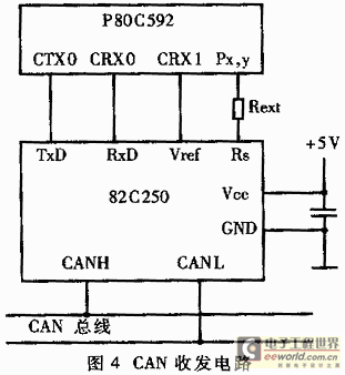 CAN总线收发器82C250是CAN控制器和物理总线间的接口,最初为汽车高速通信设计,具许多针对车辆应用设计的结构。其特点包括:有效减小汽车环境瞬间干扰对信号的影响,具有保护总线能力;防护电池与地之间发生短路;支持低电流待机方式等,因此十分适合电动车辅助逆变电源的需要。将82C250与P80C592的CAN接口输入、输出端相连,便构成了辅助逆变电源对外通讯的接口,如图4所示。