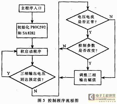 系统上电运行后,单片机P80C952首先对SA8282芯片初始化寄存器进行数据初始化,然后根据负载电机的特点执行软启动程序。当三相输出电压达到预定值时,三相逆变电源即进入稳定运行状态。此后控制程序将循环检测各线路的电压、电流情况,根据情况修改SA8282控制寄存器参数,调整PWM输出,从而改变三相输出。例如,电动车运行一段时间后,电池组电压下降,导致逆变电源的三相输出电压低于设定值,P80C592检测到该现象后,通过SA8282提高电压输出幅值,确保电源输出的稳定。