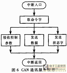 CAN总线通讯程序包含若干子程序,其基本程序结构如图6所示。当通讯程序触发后,P80C592的CAN控制器提据命令字执行相关任务。当上位机请求数据时,将逆变电源的各项运行参数传输给整车系统;当上位机查询节点状态时,将当前CAN节点状态等数据发磅出去;当上位机要求修改运行参数时,将接收的数据参数存入数据存储器。